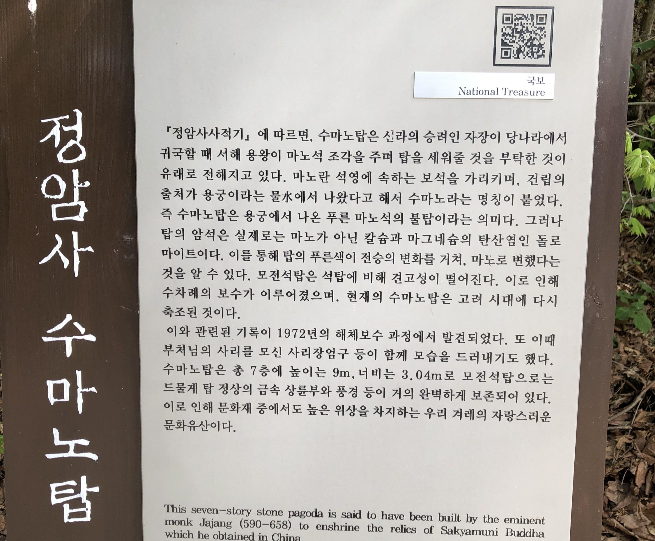이와 관련된 기록이 1972년의 해체보수 과정에서 발견되었다. 또 이때 부처님의 사리를 모신 사리장엄구 등이 함께 모습을 드러내기도 했다. 수마노탑은 총 7층에 높이는 9m, 너비는 3.04m로 모전석탑으로는 드물게 탑 정상의 금속 상륜부와 풍경 등이 거의 완벽하게 보존되어 있다.
